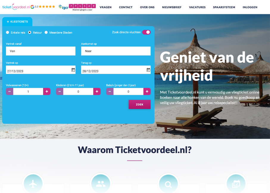 TicketVoordeel is a Dutch travel company known for its comprehensive online booking engine that covers flights, hotels, transfers, sightseeing, and travel packages. The company expanded significantly eight years ago following the success of selling package holidays to Turkey through their sister concern company AdoTravel, making individual flights easily bookable for customers worldwide. Ticket Voordeel focuses on delivering a seamless and user-friendly booking experience with competitive prices and diverse travel options.